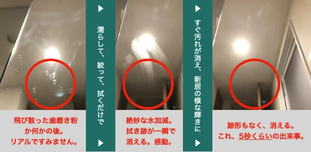 画像で見ていただいた通り、歯磨き粉後のような汚れですら、軽く拭き上げるだけで消えていきます。